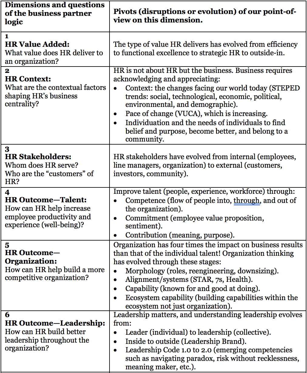 The business partner concept has dramatically evolved from roles and outcomes to a logic of how HR delivers value to employees, organizations, customers, investors, and communities through individual talent leadership throughout an organization, and organization capabilities. HR’s evolution will continue as current business issues place HR center stage (e.g., digital information age, #MeToo movement) and HR needs to continually upgrade to respond; but it is useful to move at this time from business partner 1.0 to business partner 2.0.