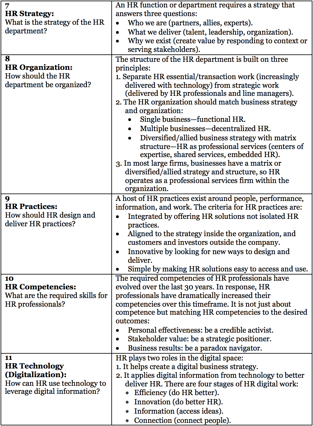 Often critics of HR compare the 1997 HR business partner 1.0 model with the 2019 business requirements, assuming that HR logic and ideas have not evolved. This would be like saying the StarTAC phone should perform the functions of today’s smartphones. So it is useful to capture the concepts defining business partner 2.0. It is difficult, if not impossible, to summarize all the business partner 2.0 ideas, but the following table highlights thirteen pivots (because they build on the past, but they could be called disruptions or evolutions as well) each of which has been the focus of our (and many others’) thinking, research, writing, and practice.